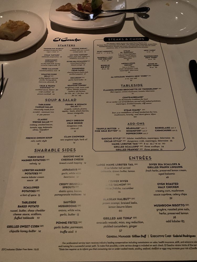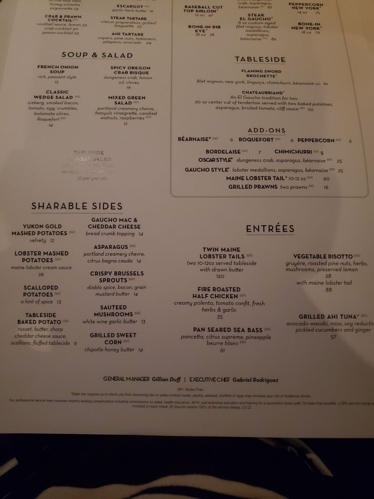 oz. center cut of tenderloin, mashed potatoes, asparagus, broiled tomato, cliff sauce. an el gaucho tradition for two!